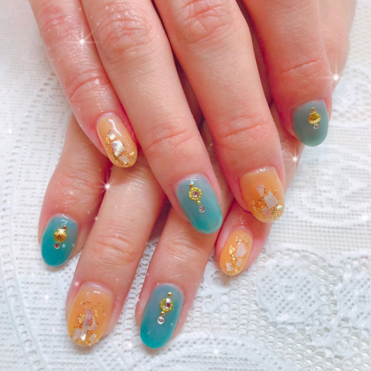 ネイル 夏 オレンジ ターコイズ